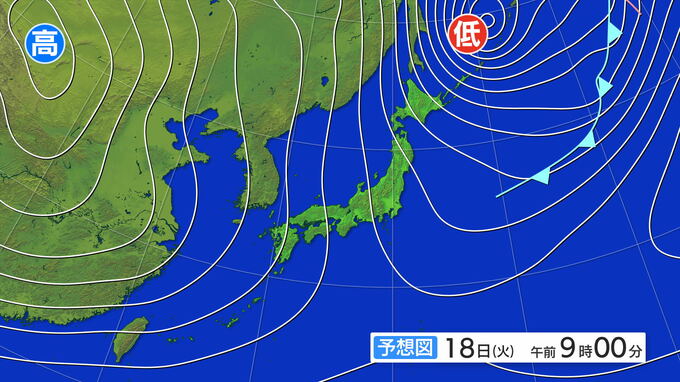 18日(火)午前9時になると、西高東低の気圧配置になり、