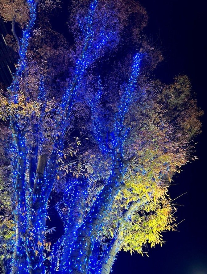 帰宅途中に撮影されたと思われる夜のライトアップされた街路樹の写真も掲載されており、青色LEDで装飾された木々が幻想的な雰囲気を醸し出しています。