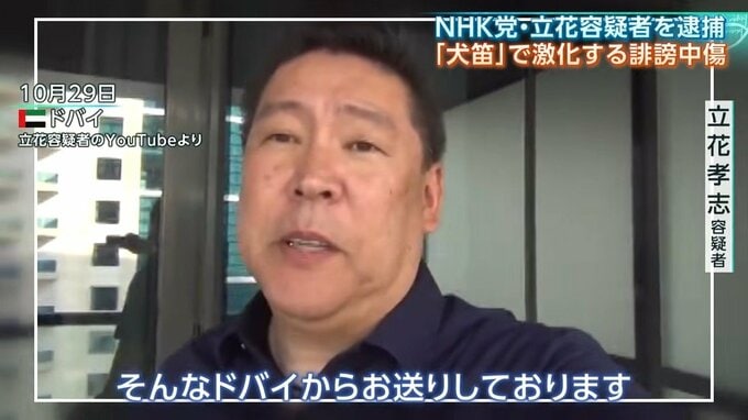 10月29日、ドバイを訪れ、その様子を配信していた立花孝志容疑者。その11日後、逮捕されました。容疑は元兵庫県議・竹内英明さんに対する名誉毀損でした。