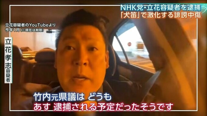 2024年の兵庫知事選。立候補した立花容疑者は、竹内さんが“知事を貶めた主犯格”などとする動画を引用し発信するなど、攻撃を始めます。街頭演説でも「警察の取り調べを受けているのは多分間違いない」などと発言。