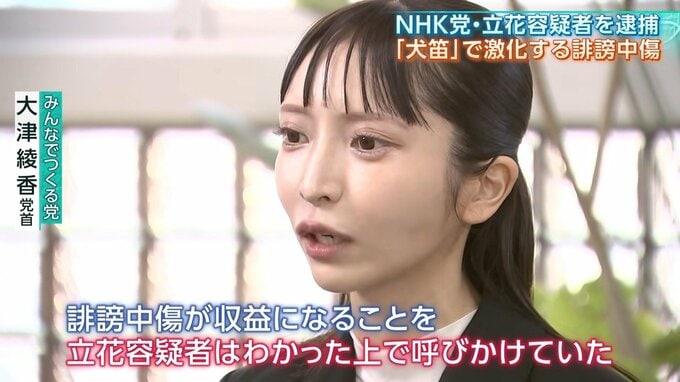 こう語るのは、かつて立花容疑者と同じ政党に属し、後任党首にもなった「みんなでつくる党」の大津綾香さんです。