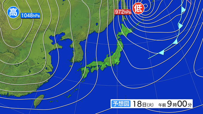 17日(月)は、低気圧が急速に発達しながら日本海北部からオホーツク海へ進み、気圧の傾きが大きくなり、「警報級の暴風」が吹くおそれがあります。また、低気圧からのびる前線が日本列島を通過し、前線に向かって暖かく湿った空気が流れ込むため、日本海側を中心に大気の状態が非常に不安定となる見込みです。