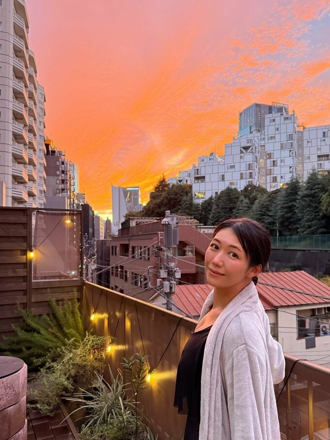 別の写真では、屋上で夕焼けをバックにポーズをとる穂川さんの姿が映っています。周囲には高層ビルが立ち並ぶ都心の景観が広がり、バルコニーには緑の植物が配置されています。夕暮れの空が暖かいオレンジ色とピンク色のグラデーションとなり、穂川さんはカメラに向かって穏やかな微笑みを浮かべています。