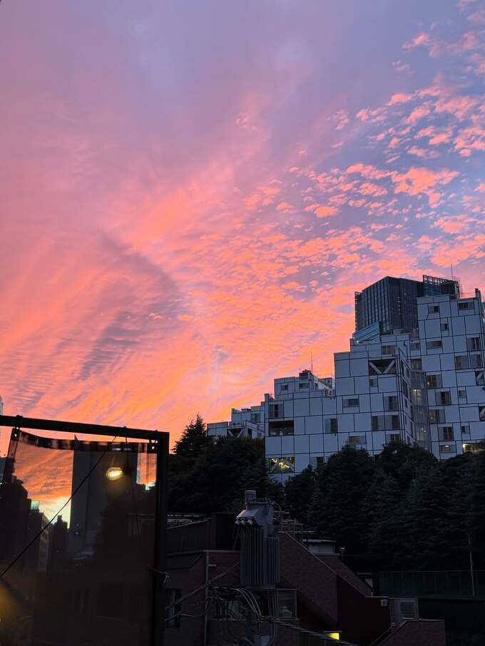 投稿された写真では、オレンジとピンク色に染まった夕暮れの空が写っています。白い高層マンション、そして街灯や樹木のシルエットが画面の前景を形作っています。日没直後の柔らかな光が街全体を包み込み、穏やかな都市の夕景が広がっています。