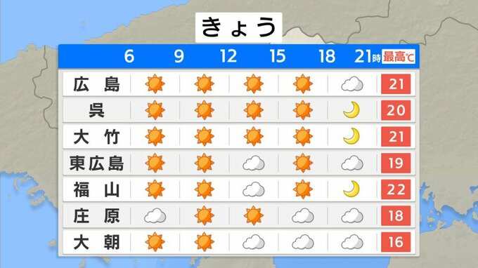 けさ(17日朝)の広島県内は、青空が広がっています。一方、北部や内陸部では霧が出ている所があります。車の運転などに注意してください。最低気温は、広島市中区11.0℃・庄原市7.5℃・北広島町1.0℃などです。氷点下の地点はありません。