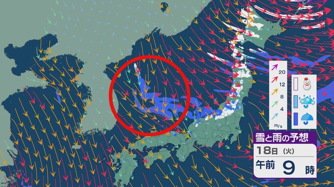 18日午前中の雨・雪と風の予想を見ると、日本海西部にJPCZが発生しているとみられます。