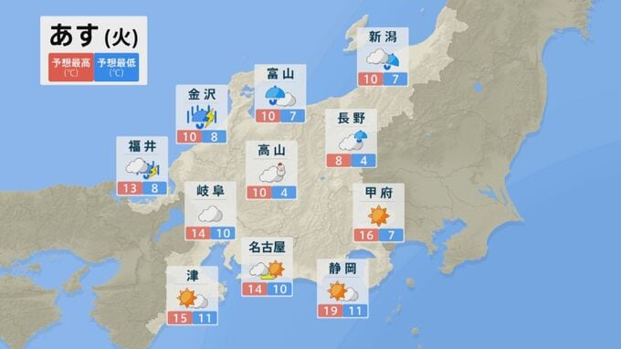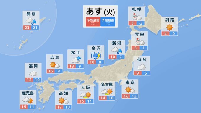 最高気温は、17日と比べ10度ほども低くなりそうです。金沢の予想最高気温は10度で12月中旬並みになりそうです。