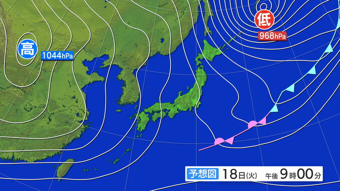 その後、あす(18日)にかけて冬型の気圧配置に移行し、北日本では850ヘクトパスカル・-12度以下、東日本~西日本では850ヘクトパスカル・-3度以下の寒気が19日にかけて南下し、あさって(19日)はじめにかけて冬型の気圧配置が続くとみられています。