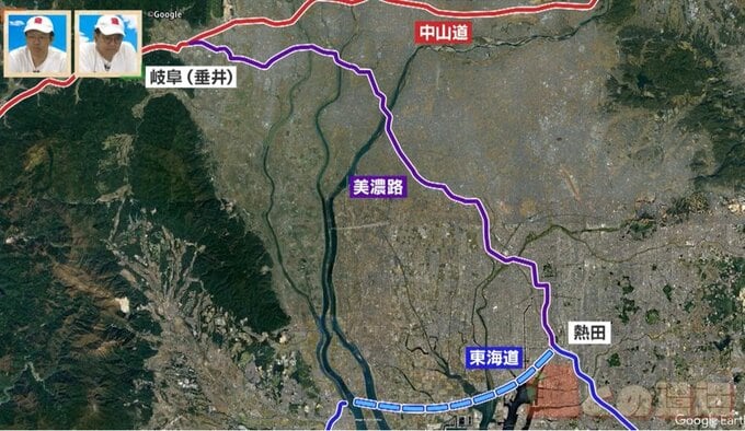 江戸と京都を結ぶ道で、熱田を通るのが「東海道」、岐阜の美濃を通るのが「中山道」。東海道は、熱田~三重・桑名を船で渡る海路だったため、「遠回りでも陸地で行きたい人は、東海道から美濃路を通って中山道に入り、京都へ向かっていた」と道マニアは言います。