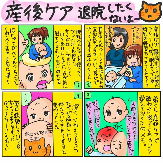 特に弟さんについては「母乳が嫌で怒って吸わない」状態だったものの、「産後ケアで吸い方を教えてくださり、毎日ちょっとずつ練習していたらちょっとだけ怒らずに吸うようになってくれた!」と成長を喜んでいます。