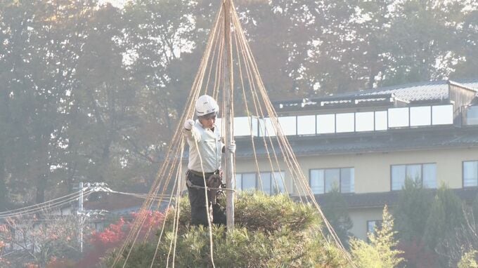 本格的な雪の季節を前に、岐阜県高山市の中心部で「雪吊り」作業が始まりました。