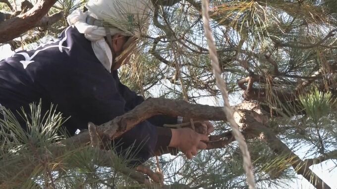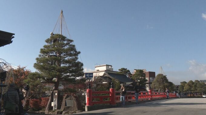 「雪吊り」は、雪の重みで松の枝が折れないよう枝を縄で吊って固定するもので、多くの観光客が訪れる高山市中心部では、毎年この時期に行われています。