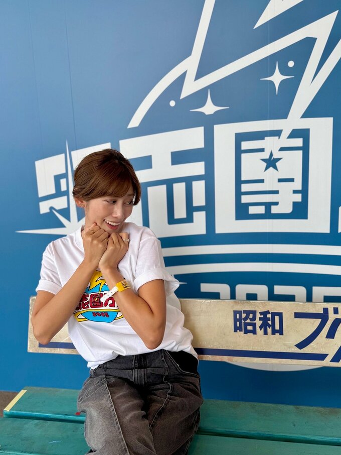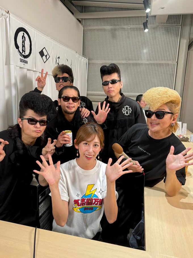 中川さんは金色の稲妻デザインが入った白いTシャツを着用し、氣志團メンバーとの記念撮影や会場の様子を複数枚の写真とともに投稿。「氣志團万博2025 バックステージからの中継を担当させていただきました」と報告しています。