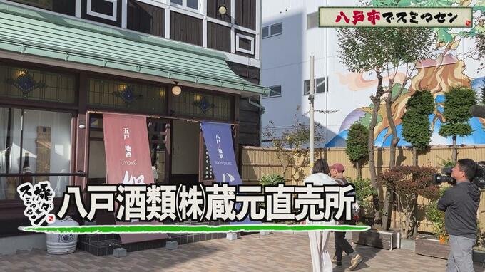 続いて2人は、素敵な建物を発見。大正13年に建築された『八戸酒類(株)蔵元直売所』です。モダンな外観が特徴で文化庁登録有形文化財にも指定されています。八戸酒類の商品を販売している他、1杯300円でお酒の試飲もできます。
