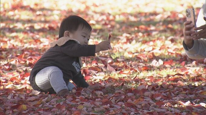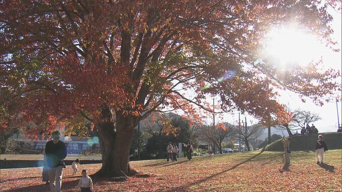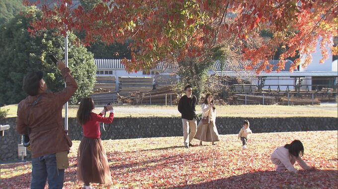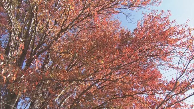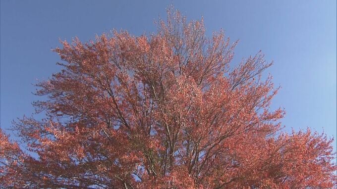 真っ赤に色づいた樹齢約90年のシンボルツリー 巨大「ハナノキ」が見頃に 吹奏楽部の演奏も 三重・松阪市の飯南高校