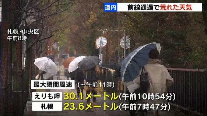 道内で最も強い風が吹いたのはえりも岬で、午前11時前に最大瞬間風速30.1メートル、札幌でも午前8時前に23.6ートルを観測しました。