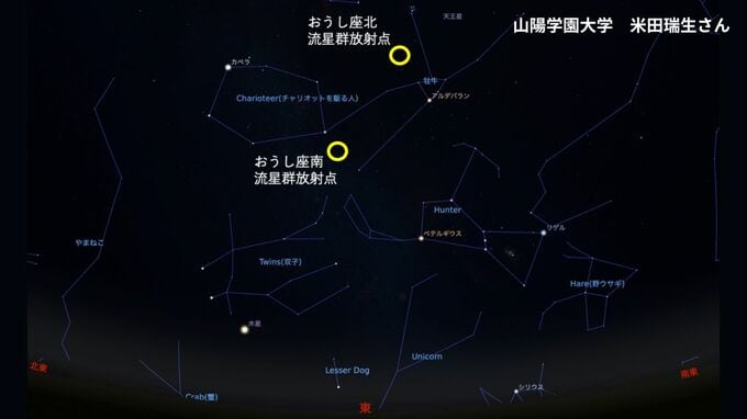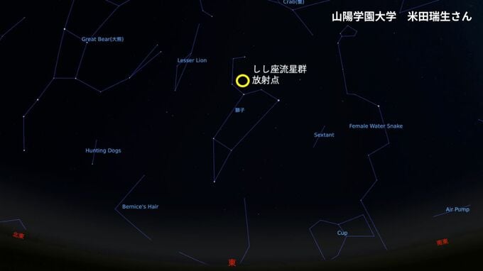 しし座流星群「いつ どの方角を見る?」18日未明がピークの予想 極大の時間帯に月が沈み「絶好の条件」おうし座流星群も活動期【2025】 RSK山陽放送 2025年11月17日(月) 13:48 国内 小林章子 いつ、どこを見る? ──いつ、どこを見たらよいでしょうか。 米田瑞生さん 「おうし座流星群は、一晩中見えている、おうし座の方向から放射されます。夜前半は、夜空の東側、後半は西側という、大雑把な感覚でいいと思います。放射点は、2つありますが、気にしなくても、おおよそ、おうし座の方向と考えていれば、問題ありません」 おうし座流星群の放射点 17日22時 岡山の空 「しし座流星群は、未明にやっと東の空に登ってきます。ですから、おおよそ、一晩中、東の空から流れる流星群です。未明が特に発生しやすい流星群です」 しし座流星群 18日午前3時の岡山の空