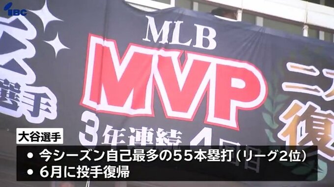 横断幕には「MVP3年連続4回目」、「二刀流復活」と大きく掲げられています。