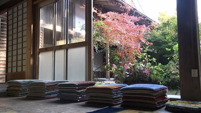 真っ赤に色づいたモミジに、黄色のイチョウが秋の風に揺れます。紅葉の見頃を迎えた岡山市北区の金山寺です。今、紅葉とともに楽しめるのが、イランの遊牧民の伝統手織り絨毯「ギャッベ」【画像②】。訪れた人に秋をより楽しんでもらいたいと毎年この時期に開いているものです。4回目となる今回は、今までで最も多い約200種類のギャッベが客殿に展示されています。