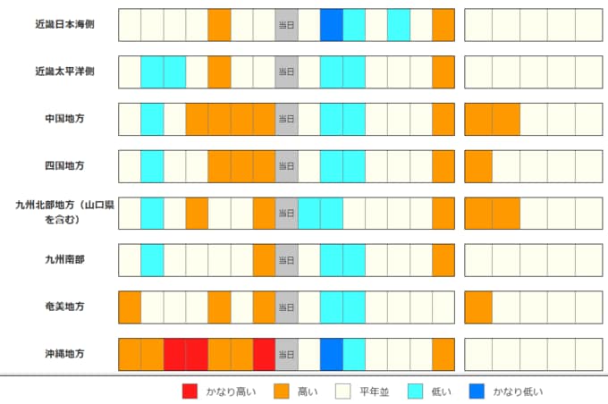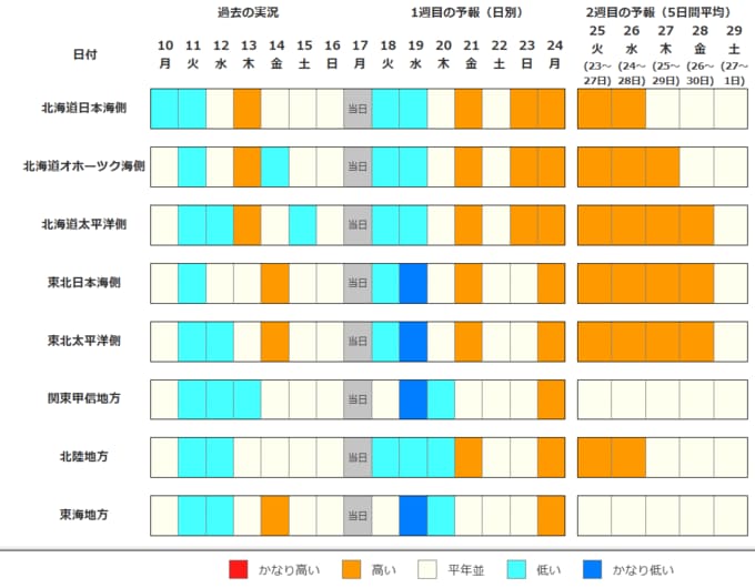 ・2週目の予報は中心の日に前後2日間を加えた5日間の平均(平均気温の5日間平均)です。平均期間は中心の日の下に表示しています。2週目のかなり高い(かなり低い)は、かなり高い(かなり低い)気温となる確率が30%以上のときに表示します。