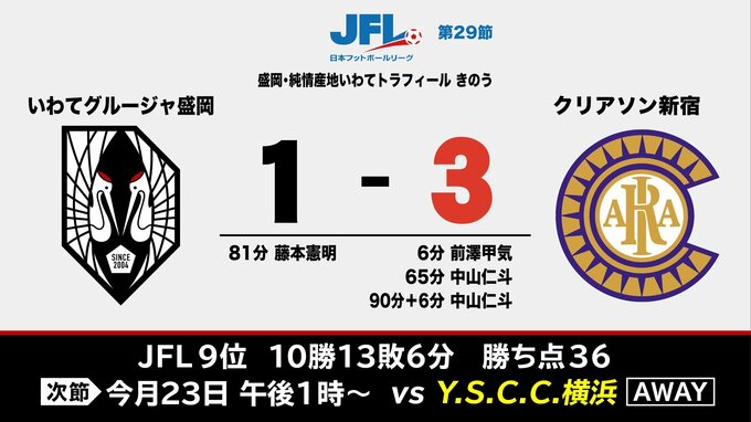 JFLのグルージャ盛岡は16日が今季のホーム最終戦で、クリアソン新宿と対戦しました。
