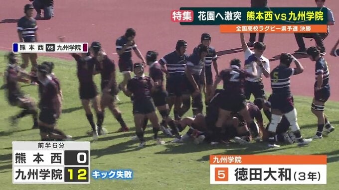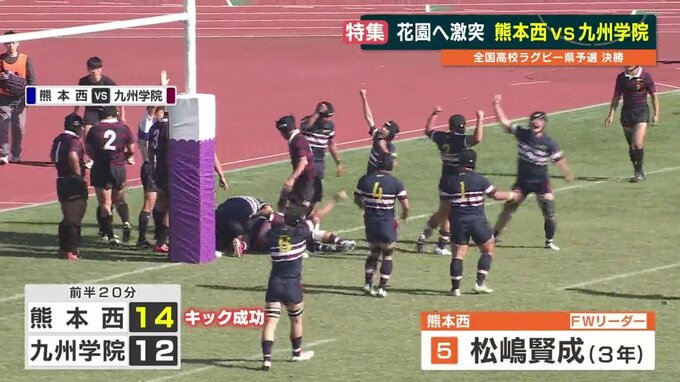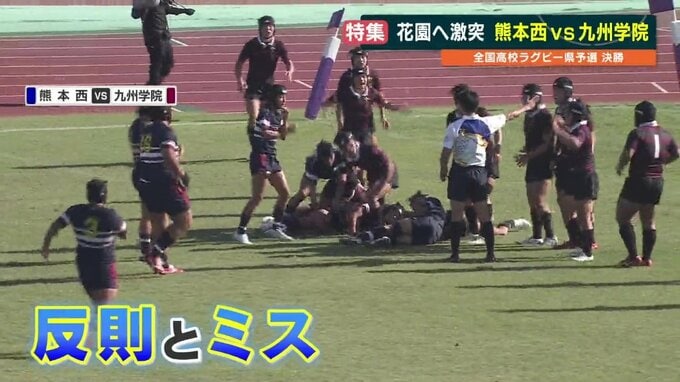 その後、両チーム1トライずつ奪い、熊本西が2点リードで前半を終えます。