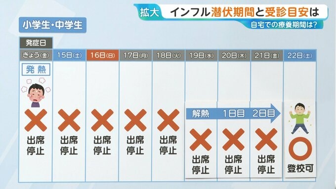 これが最低限の日数で、例えば発症日から5日目に解熱した場合、解熱した日を0日としてその後2日間休むこととなります。