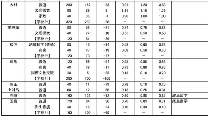 長崎県公立高校入試2026「進学希望状況調査(第2回)」学校別トップは諫早1.33倍、学科別は長崎西・理系コース1.85倍【全校掲載】 長崎放送 2025年11月17日(月) 20:00 国内 【大村、猶興館、松浦、対馬、豊玉、上対馬、壱岐、五島】 大村は文理探求科が1.11倍と、80人の定員に対し進学希望者が89人となりました。 猶興館、松浦、対馬、豊玉、上対馬、壱岐、五島の進学希望倍率は、いずれも「1」を下回りました。上対馬は0.15倍となっています。