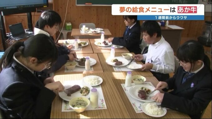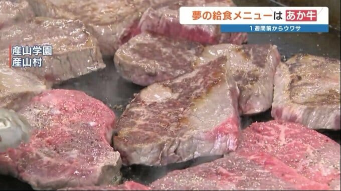 11月17日は、産山学園で年に一度の「夢の給食」。ふるさと自慢の特産、あか牛のステーキがメニューに登場しました。