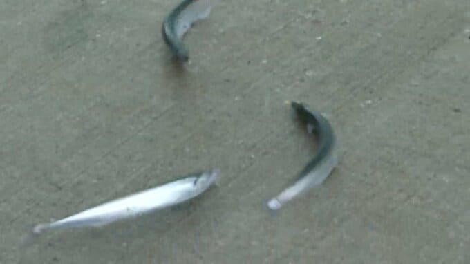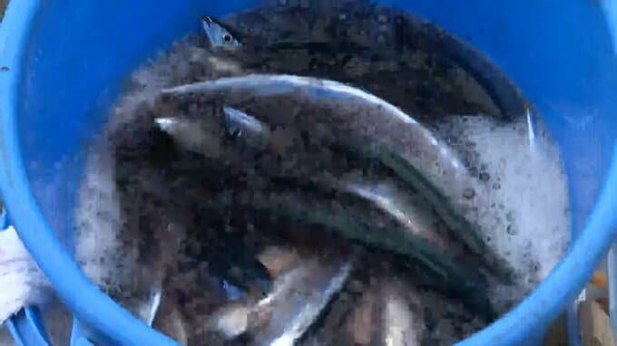 釣り糸を垂らすと、次々とサンマが釣れます。3匹のサンマが一気にかかった釣りざおも。