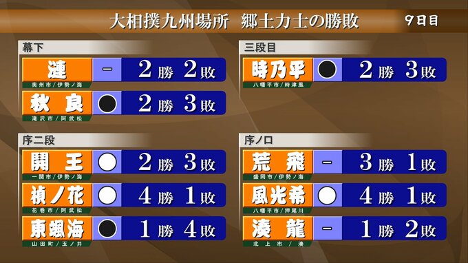 大相撲九州場所9日目、郷土力士の勝敗です。