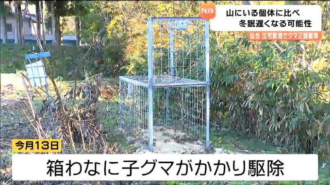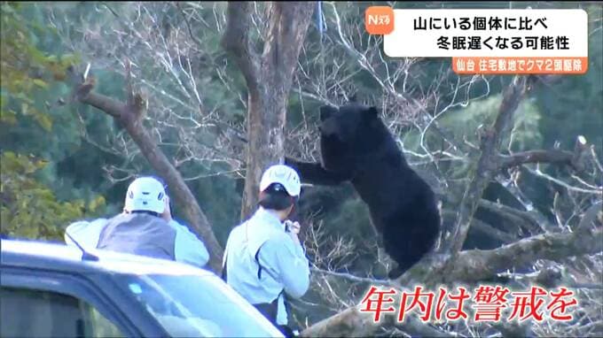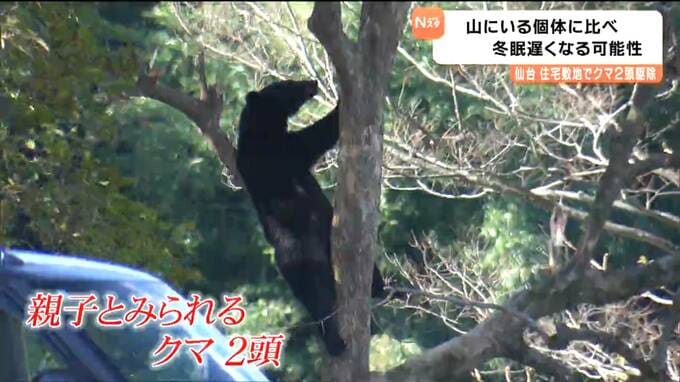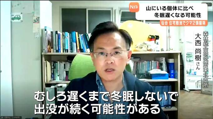 現場は仙台市西部の住宅地。付近では、11月13日にも箱わなに子グマがかかり駆除されています。専門家は、市街地に出没しているクマは、山の中にいる個体と比べ、冬眠する時期が遅くなる可能性があると指摘します。
