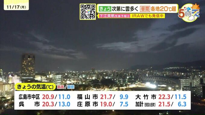 きょう17日(月)の広島県内は、昼過ぎにかけてよく晴れて、日中はぽかぽか陽気になりました。最高気温は20℃を超えた地点が多く、小春日和でしたね。午後はだんだんと雲が広がり、にわか雨の地点もありました。
