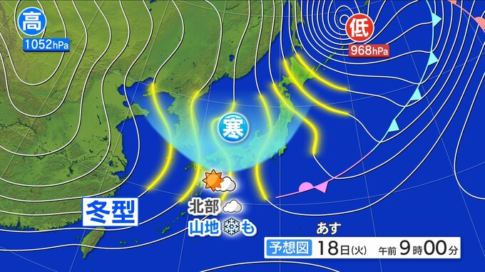 18日(火)南部はおおむね晴れ 北部ほど雲が広がりやすい 山地は雪の可能性