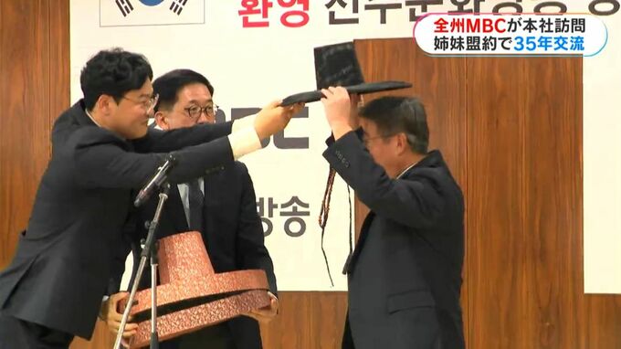 きょう17日、全州MBCの社長ら5人が鹿児島市のMBC本社を訪れました。歓迎式ではMBCの中野寿康社長が「地域に根ざした放送局同士が手を携え新しい時代の放送文化を共に作り出しましょう」とあいさつし、互いに記念品を贈り合いました。
