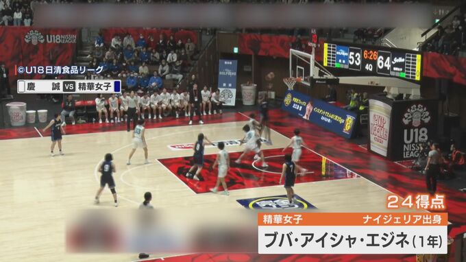 しかし、身長188cmの留学生、精華女子1年生の ブバ・アイシャ・エジネに24得点を許す苦しい展開に。