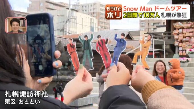 札幌市東区の札幌諏訪神社です。ファンのお目当ては、メンバーカラーの花手水。さっそく、推しのぬいぐるみと記念撮影です。