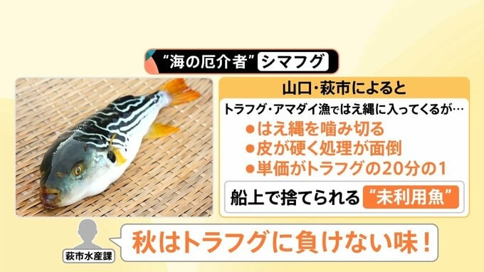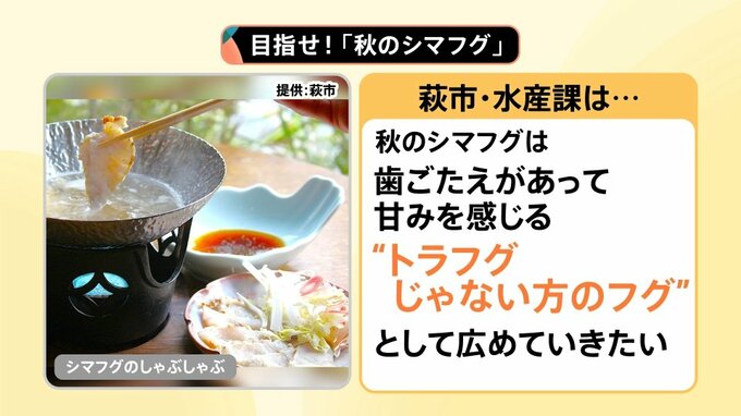 「シマフグ」の味は「トラフグ」と比較して、「歯ごたえがあって、甘みがある」ということです。そのため萩市・水産課は、「秋のシマフグは歯ごたえがあって甘みを感じる。“トラフグじゃない方のフグ”として広めていきたい」と話していました。