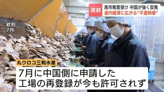 輸出するには加工施設などを中国当局に再登録する必要がありますが、許可された業者は少なく、紋別市に工場を持つ「丸ウロコ三和水産」では7月に行った申請が今も許可されていません。