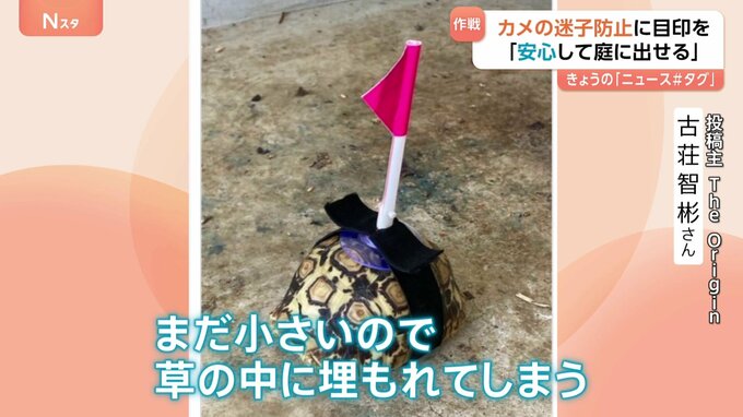 SNSに投稿された、カメの写真。甲羅の上につけられているのは旗です。これは一体…投稿主 The Origin 古荘智彬さん「日光浴をさせるために庭に出しているんですけど、まだ小さいので草の中に埋もれてしまう」旗…