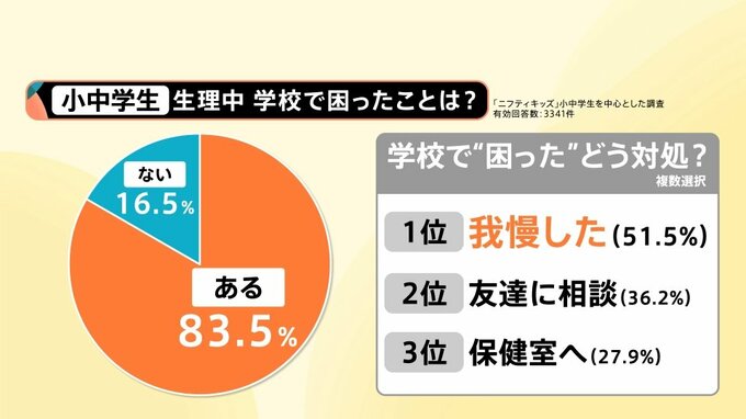 生理についての理解を深めようという取り組みは行われていますが、小中学生を対象に行った調査によると、「生理中、学校で困った経験がある」と答えた人が83.5%、「ない」と答えた人が16.5%でした。(「ニフティキッズ」小中学生を中心とした調査 有効回答数:3341件)