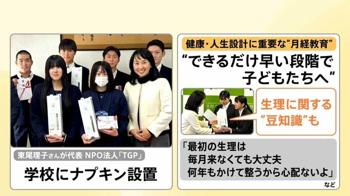 東尾さんが代表を務めるNPO法人「TGP」では、学校に無料の生理用ナプキンを設置しています。緊急用のためだけではなく、「健康・人生設計に重要な“月経教育”を、できるだけ早い段階で子どもたちへ届けたい」という思いがあるそうです。
