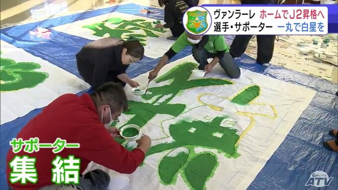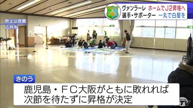 一夜明けた16日は、昇格を争う鹿児島とFC大阪が敗れれば次節を待たずして昇格が決まるなか、サポーターたちは八戸市内の公民館に集まり、11月23日のホーム最終戦で掲げる新たな「応援旗」を作っていました。