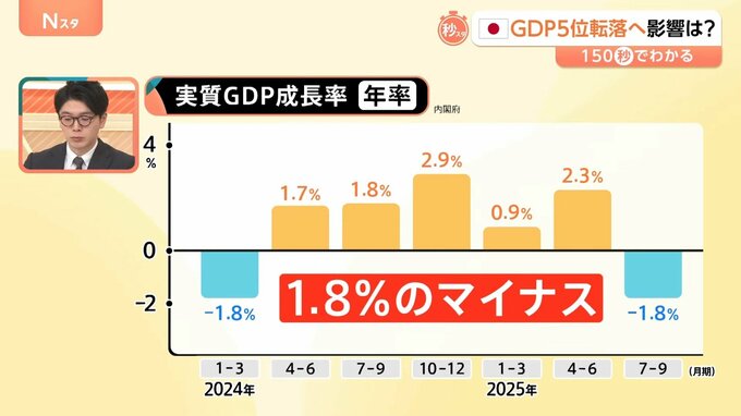 2025年7月から9月までのGDPは前の3か月と比べて年率換算1.8%のマイナスで、2026年、日本の名目GDPは、インドに抜かれ世界5位になる見込みです。