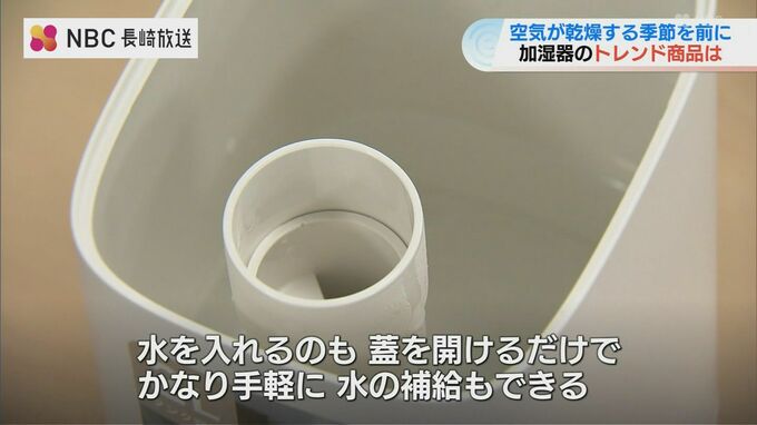 ハンズ長崎店の山下雄大さんによると、今年の売れ筋は、『スリム』で『大容量(2L)』で『給水が手軽』なモデル。3段階の蒸気量をボタン1つで操作できることも人気の理由とのこと。