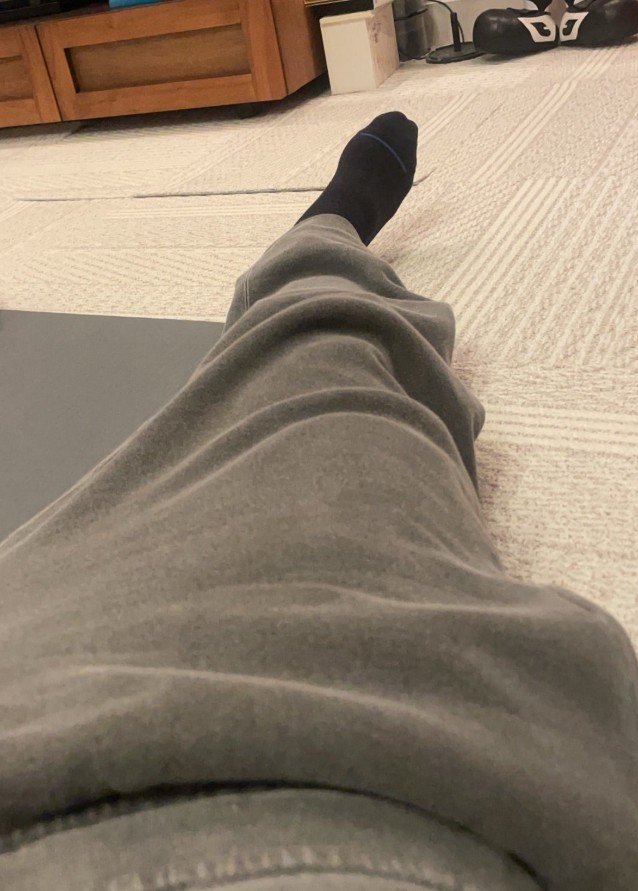 最後の写真では、食事後と思われる休息の様子が映し出されています。灰色のパンツに黒い靴下を履いた足が床に伸ばされ、リラックスしている姿が捉えられています。