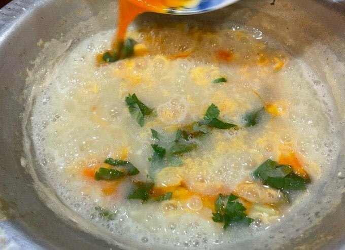 三枚目の写真では、締めの雑炊の調理過程が写されています。金属製の鍋の中では白濁した液体が煮立ち、玉子が注がれる様子が写っています。
