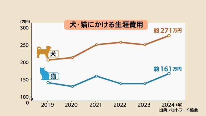 ペットフード協会によりますと、ペット一頭あたりの生涯にかける費用は増加傾向で、「ペットも家族」という思いが数字にも表れています。