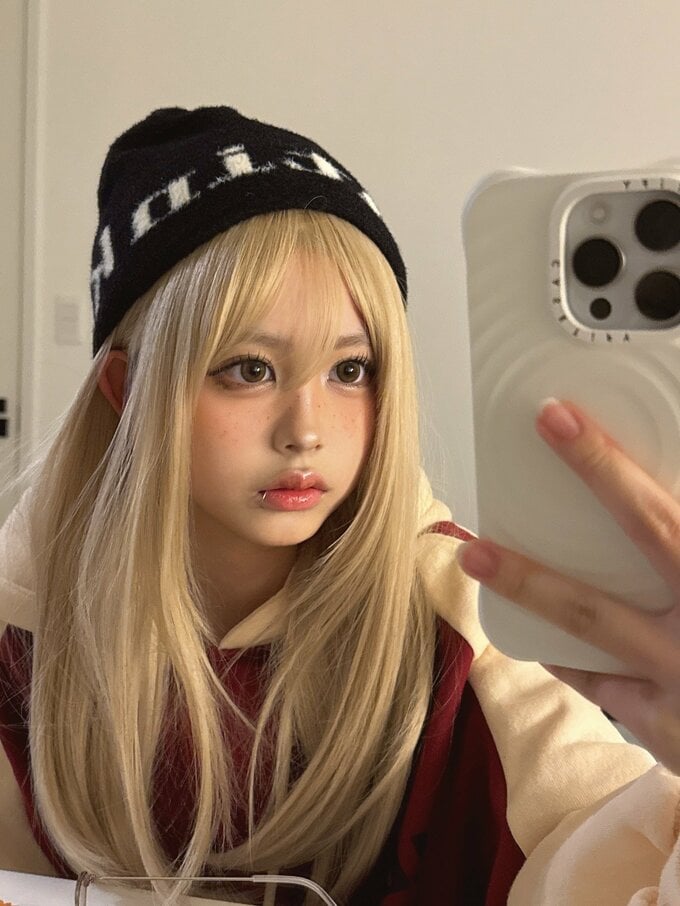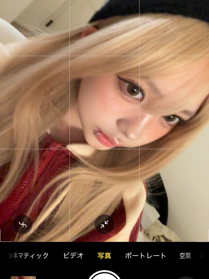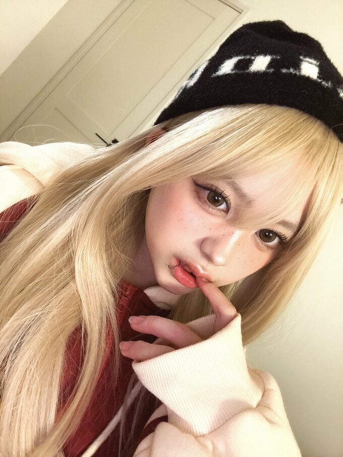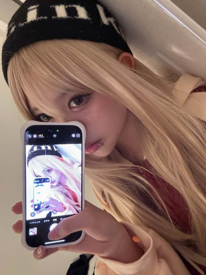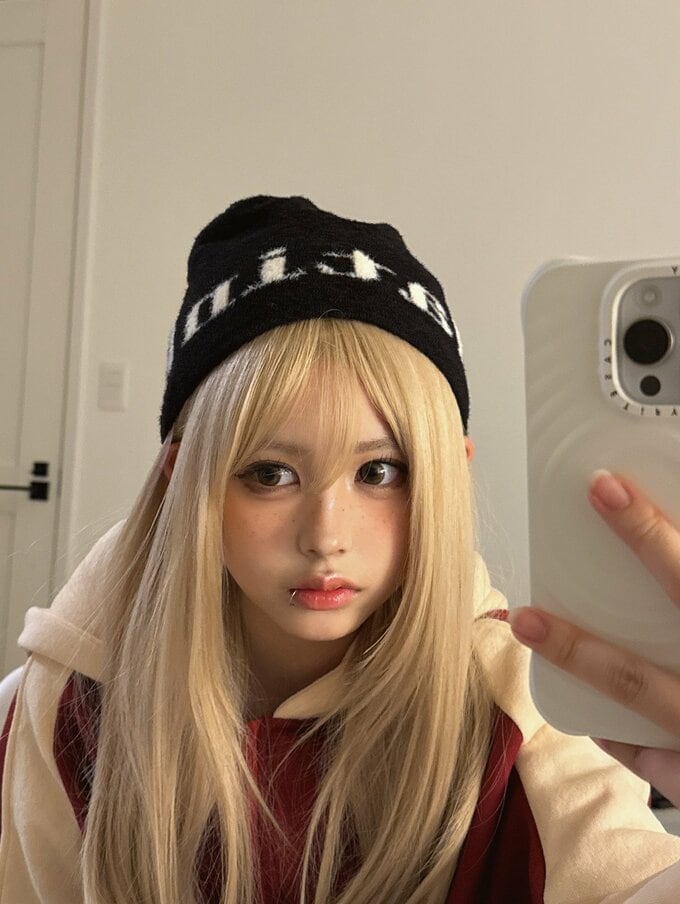 公開された写真には、長い金髪姿の梶原さんが室内で自撮りする様子が映っています。黒いニット帽に赤と白のパーカーを着用し、唇にはピアスをつけています。