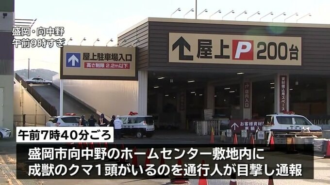 警察や市によりますと、18日午前7時40分ごろ、盛岡市向中野のホームセンターの敷地内に、成獣のクマ1頭がいるのを通行人が目撃して警察に通報しました。